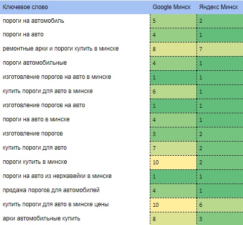 - анализ конкурентов. Мы продвигали сайт по высокочастотным запросам (то есть тем, которые пользователи вводят в поисковые системы чаще всего), а также среднечастотным запросам. Продвижение необходимо было не только по Минску, распространялось на Гомельскую, Витебскую и Брестскую области. По коммерческим запросам отмечалась высокая конкуренция, но мы обнаружили, что большинство конкурентов свои сайты не оптимизируют. Также до начала сезона у нас было несколько месяцев в запасе, у нас было время на тестирование продвижения по ВЧ запросам, поэтому при необходимости их можно было скорректировать;