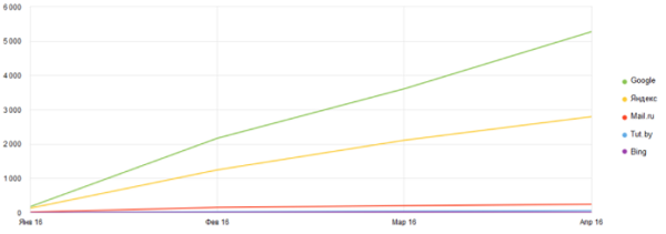 Раскруткой мы занимались несколько месяцев, с января до апреля 2016 года. За это время нам удалось вывести ресурс в ТОП 10 поисковиков. Трафик из Гугла к апрелю был же более 8000 уникальных посетителей в месяц.